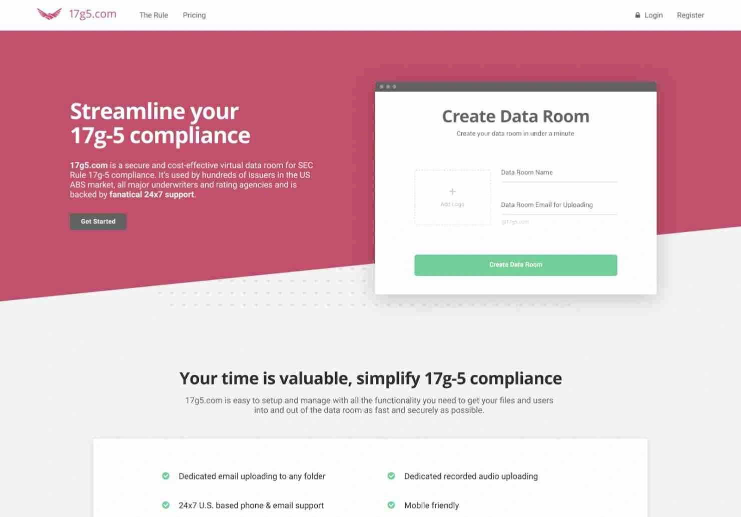 17g5.com is a secure, cost-effective virtual data room built to streamline compliance with SEC Rule 17g-5. It enables issuers, underwriters, and rating agencies to manage and share transaction-related information efficiently with robust security and 24/7 support.