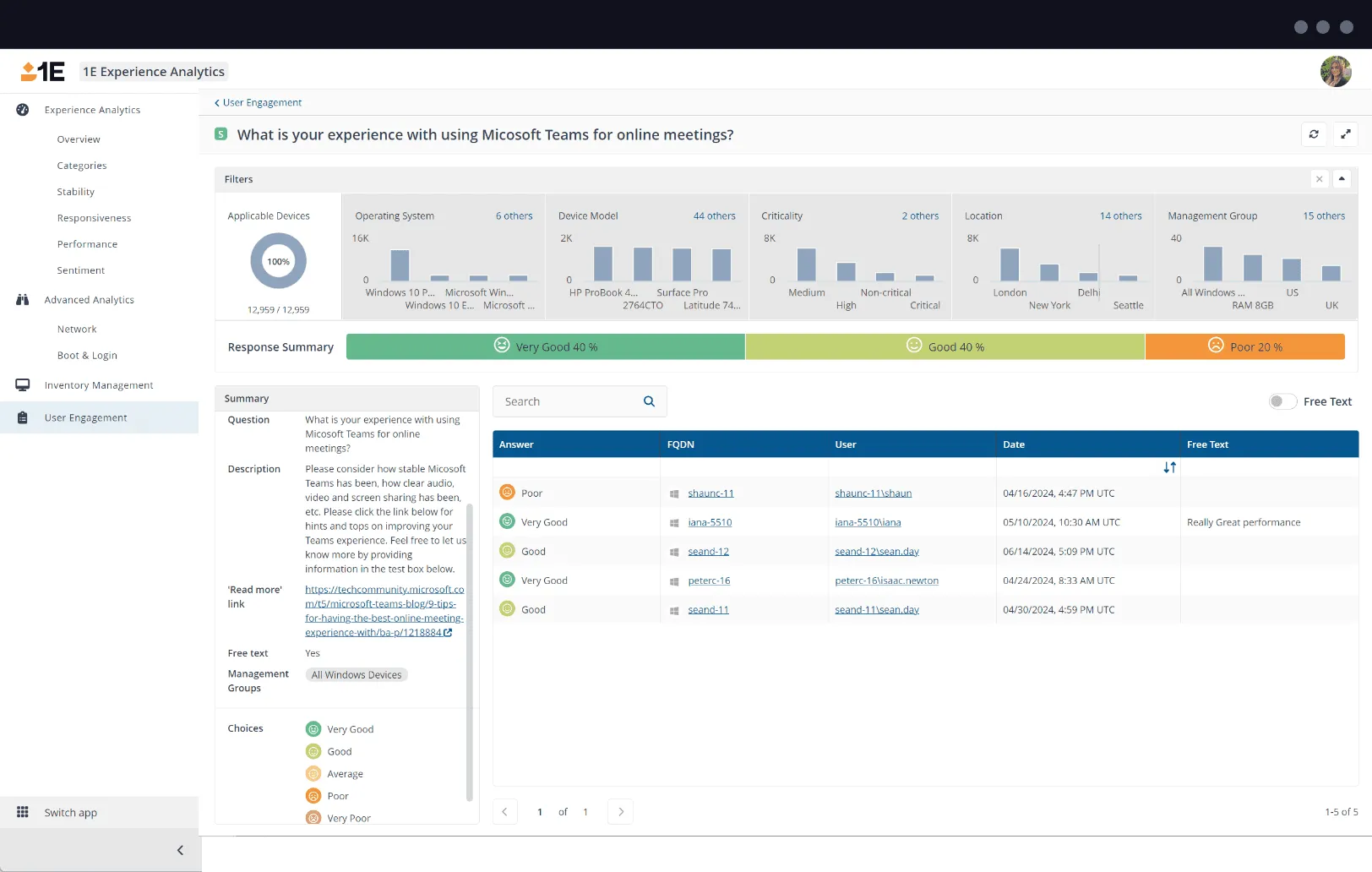1E Employee Sentiment continuously collects and measures end-user feedback on key drivers of digital workplace satisfaction.