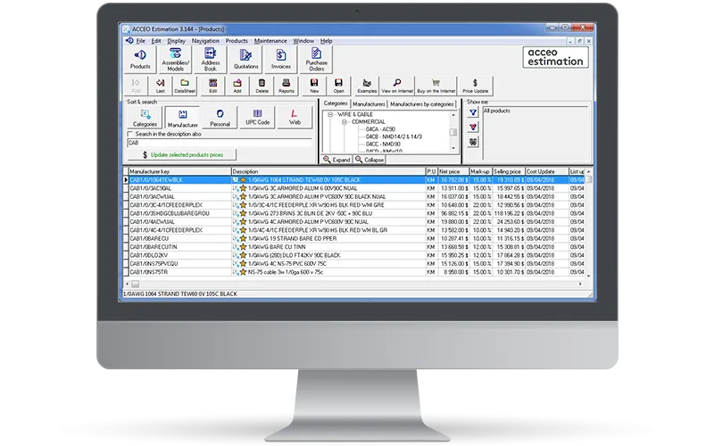 Real-time access to your distributor’s product list and negotiated net prices. With ACCEO Estimation, find all your product information in one place. Our software makes it easier to view and search products, and create assemblies and quotations. Get the most current net prices for your products. All your products in a single location Our software integrates our distribution partners’ product catalogues and modifications are synchronized in real-time. With our real-time product updates, you will always know which products are available. Then you can simply adjust your bids. Powerful tools to simplify search Advance search tools help you find products and assemblies more quickly. Identify the right products by viewing photos and data sheets. Select preferred products and reuse them for future projects. Add products to your software Add products exclusively available in online catalogues, then order them from distributor. Integrate your own products to your bids using ACCEO Estimation’s advanced feature. Net prices for your own account Always find the net negotiated prices to use in your bids. Manage your selling price efficiently by simply adding the percentage for your profit. Quickly determine if the project will be profitable for you. Price update available 24/7 Update your global product list or your preferred product list anytime. Recalculate your bids with updated prices in no time. Assemblies to speed-up your bid processes Organize your products into assemblies to save valuable time in producing your takeoffs and quotations. Many preset product assemblies.
