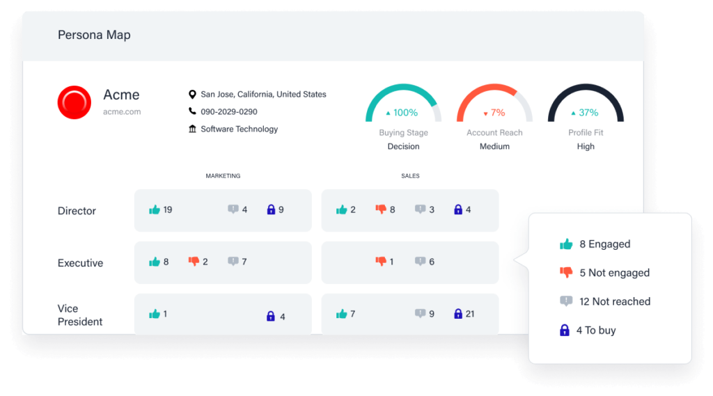 - **Persona Map: **Leverage a visual map of an account’s buying team to understand how to craft multi-threading plans. Our Persona Map presents contact details, activities, talking points, and unknown buying team members.