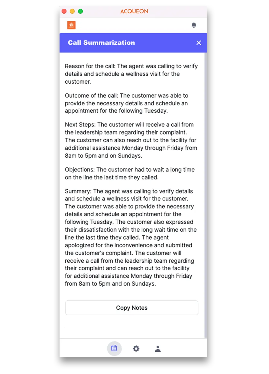 - Say Goodbye to Manual Notetaking, Focus on Your Customers Instead: No more wasting time taking notes during customer interactions. Deliver an exceptional customer experience every time without scrambling to jot down important information or putting customers on hold. Acqueon Summarize captures the entire conversation and conveniently generates post-call notes right in the agent workspace.