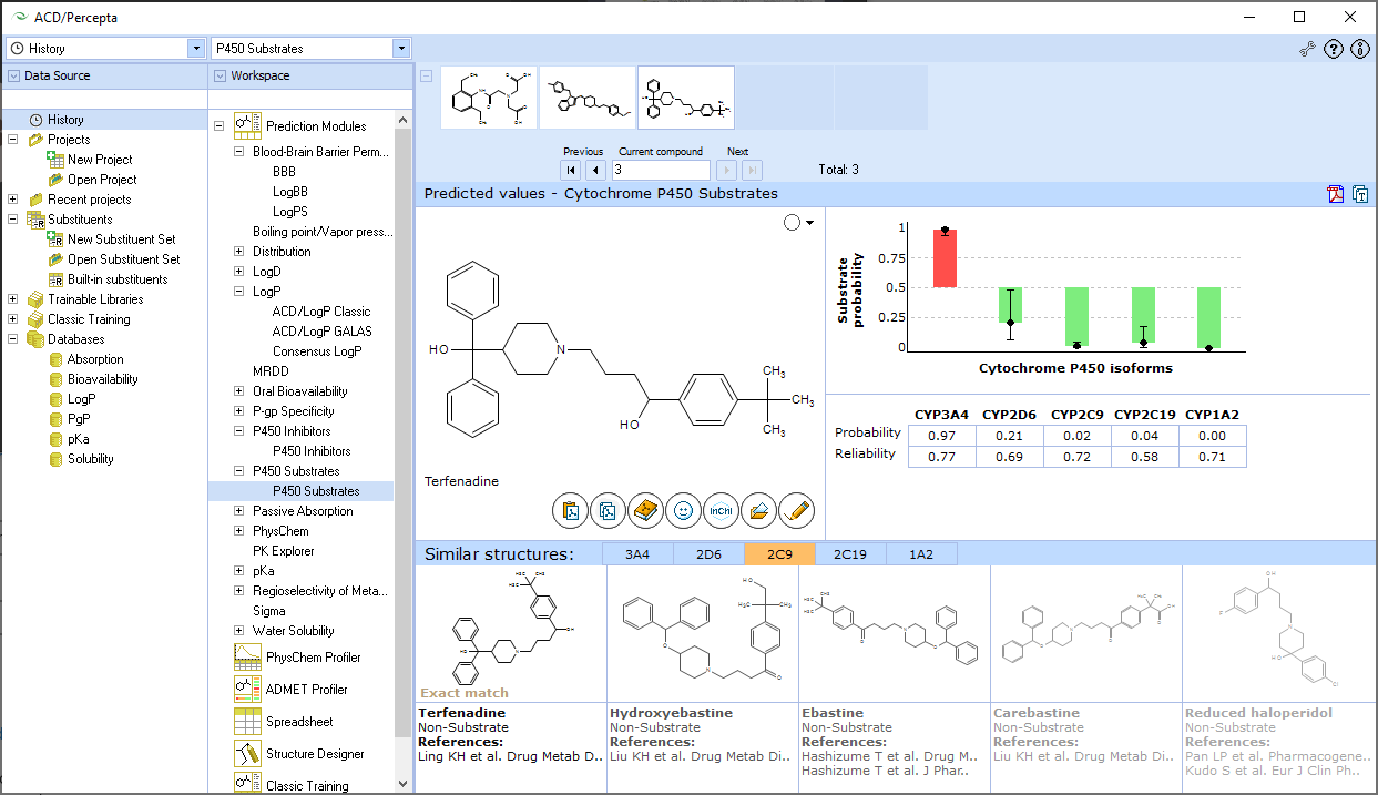- Quickly calculates properties for single compounds or large libraries, based on curated experimental data, with a reliability index.