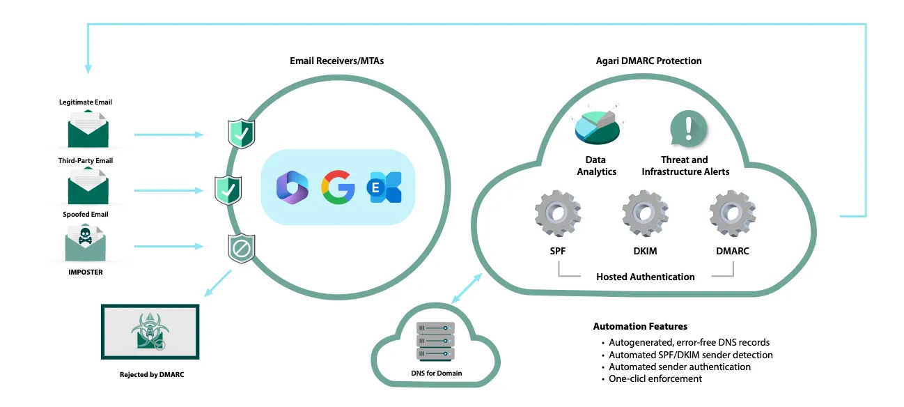 Agari DMARC Protection stops phishing by automating the process of DMARC email authentication and enforcement to protect customers from cyberattacks and by instructing receiving mailboxes to reject inbound messages that fail DMARC authentication, thereby boosting engagement & customer loyalty.