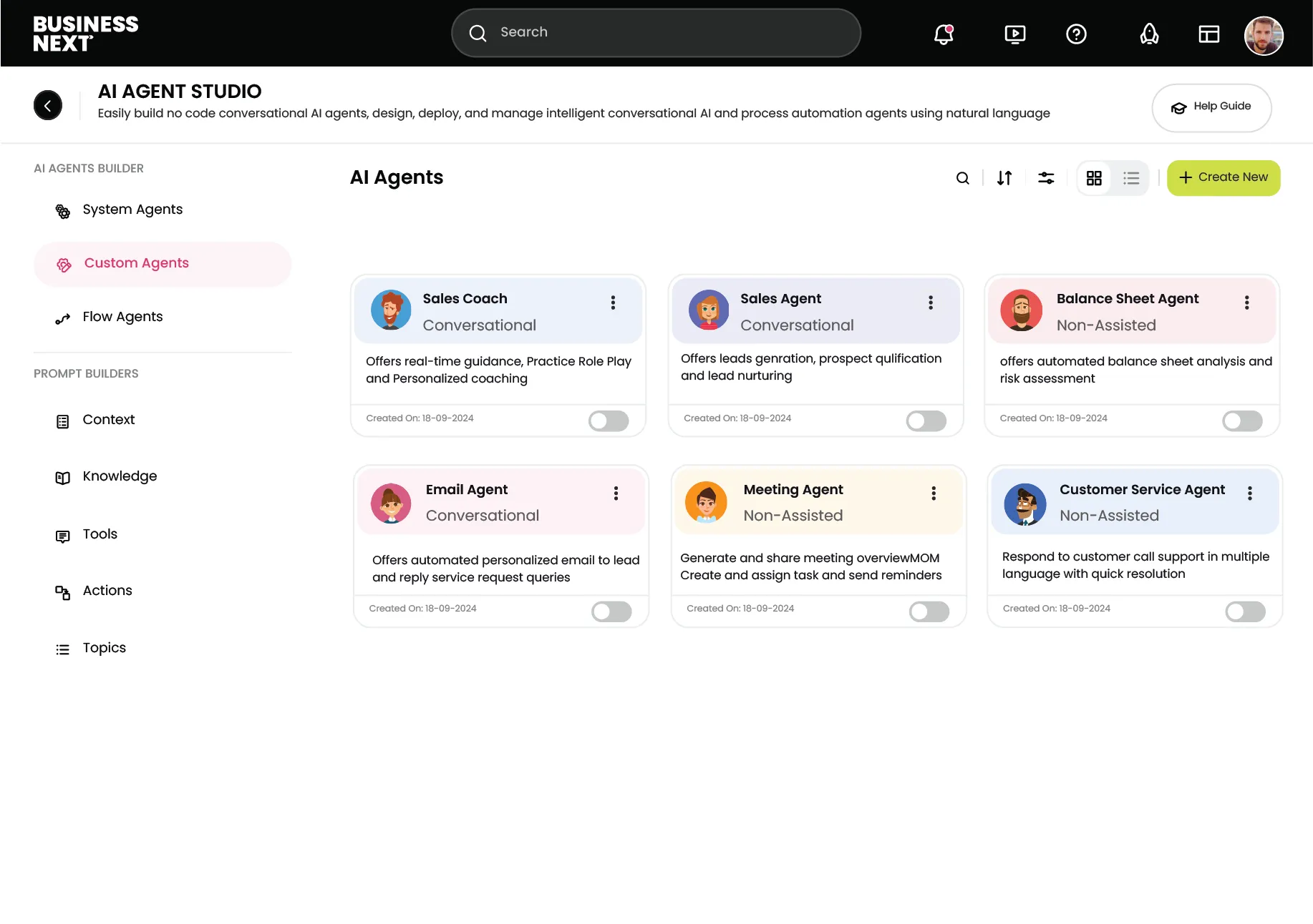 - AI Agent Studio: Features a drag-and-drop interface for agent design, offering pre-built templates for common agent types alongside NLP configuration tools, machine learning model integration, and API connection wizards for seamless data source linking.