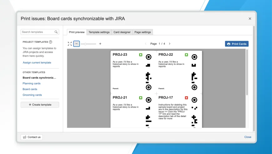 Print issues instantly from various places across Jira. Populate your physical task board with user stories for improved team performance.