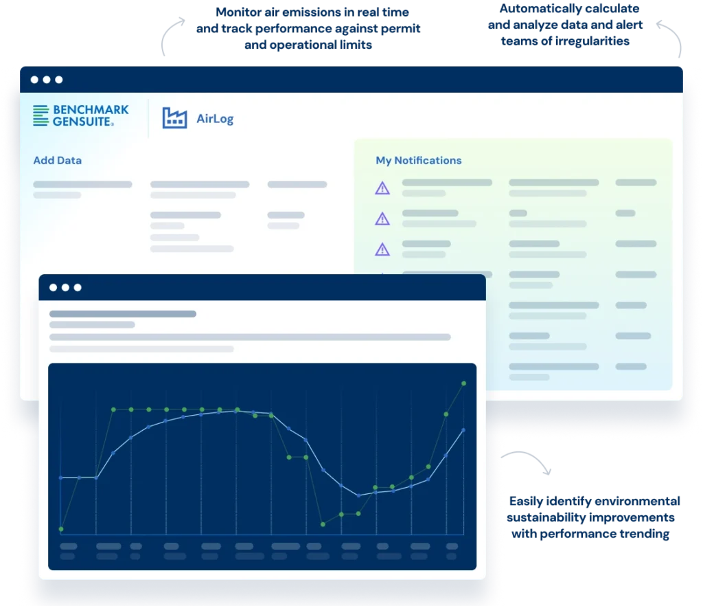 AirLog is an air emissions and GHG management application within the Benchmark Gensuite platform that centralizes capture, tracking, and regulatory reporting of air emissions across distributed sites. It supports data historian imports for bulk data, mobile field entry, automatic notifications for threshold and permit exceedances, owner assignment for actions, and configurable dashboards and analytics to support compliance and sustainability improvement.
