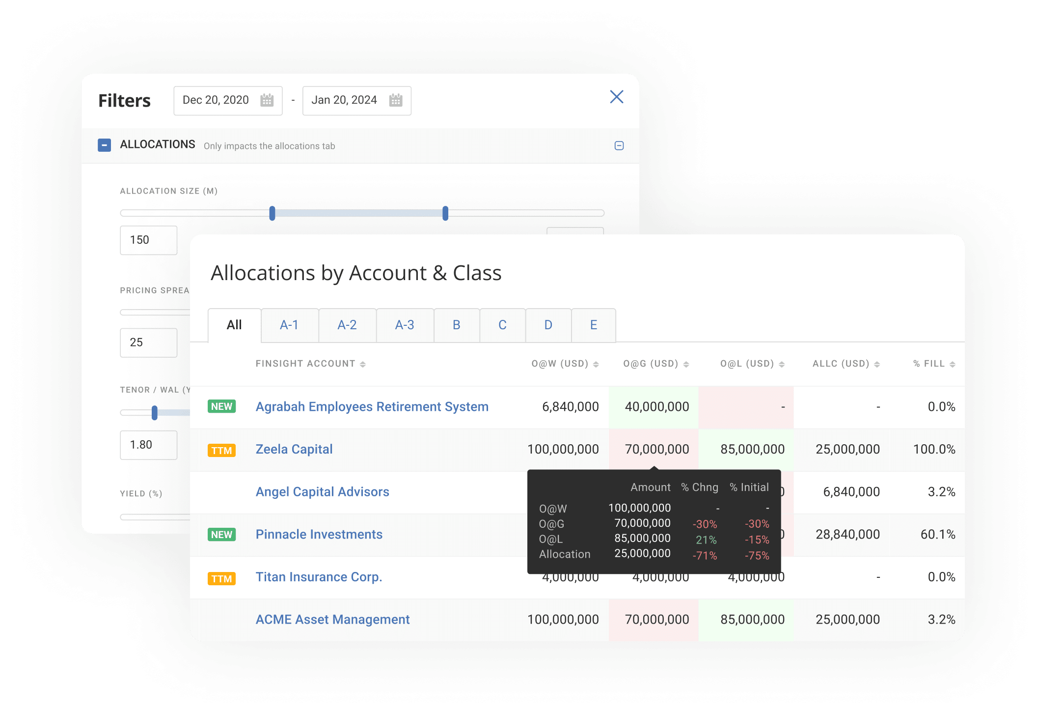 Allocate by Finsight is a powerful business intelligence platform that transforms investor orders and allocations data into actionable insights. It helps issuers and broker-dealers understand investor behavior, improve syndication, and optimize execution in fixed income and equity primary offerings.