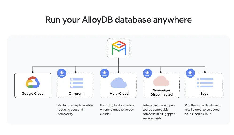 - AlloyDB Omni allows deployment in any cloud or on-premises.