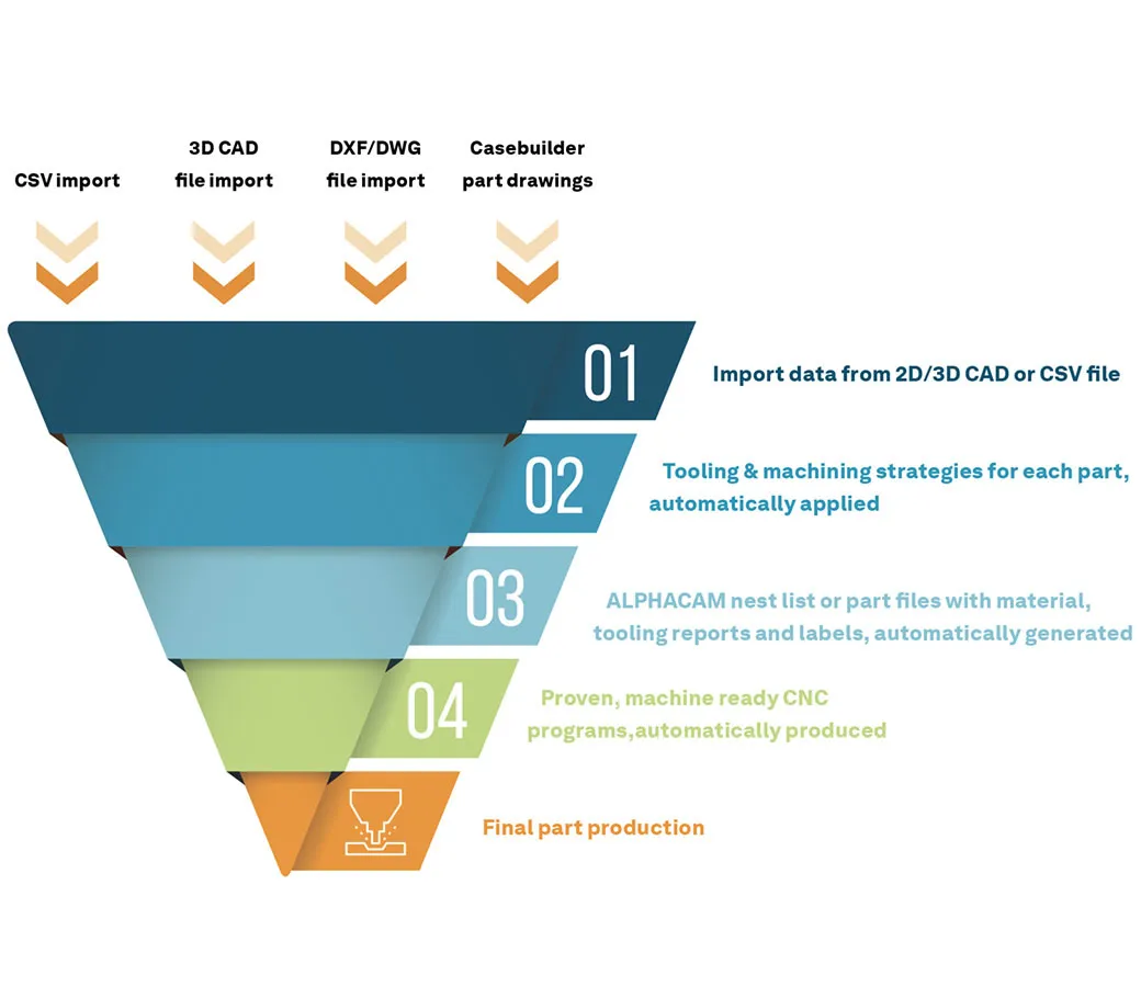ALPHACAM xAutomation is an advanced module within the ALPHACAM suite, designed to significantly reduce programming time by automating repetitive tasks in the manufacturing process. It enables users to batch process both 2D and 3D CAD files, as well as solid models from third-party software, streamlining workflows from initial file preparation to the automatic generation of NC code. This comprehensive automation not only accelerates production but also ensures consistency and accuracy across operations, making it an invaluable tool for industries involved in woodworking, metal, and stone cutting.