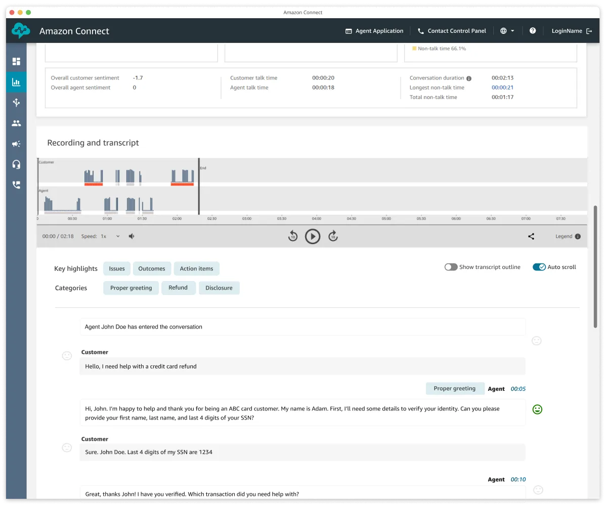 Detect and redact sensitive customer data such as credit card details, addresses, and social security numbers from audio recordings and transcripts. You can also improve agent compliance with company policies or regulatory requirements by tracking all customer conversations for script adherence using categorization based on criteria you determine. For example, you can track words or phrases used in required disclaimers, greetings and sign-offs.