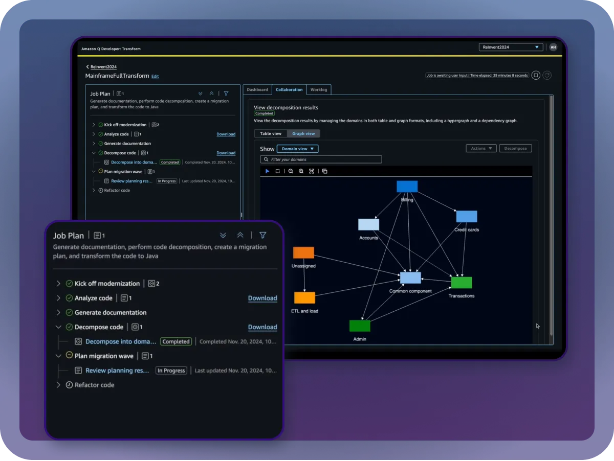 Offload labor-intensive, complex transformation tasks across the discovery, planning, and execution phases to Amazon Q Developer agents with expertise in languages, frameworks, and infrastructure, freeing your teams to innovate.
