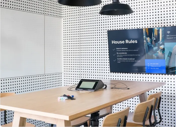 - Collaboration Spaces: Extend corporate communications to conference rooms and meeting spaces, sharing company messages and announcements that can be localized by room or office.
