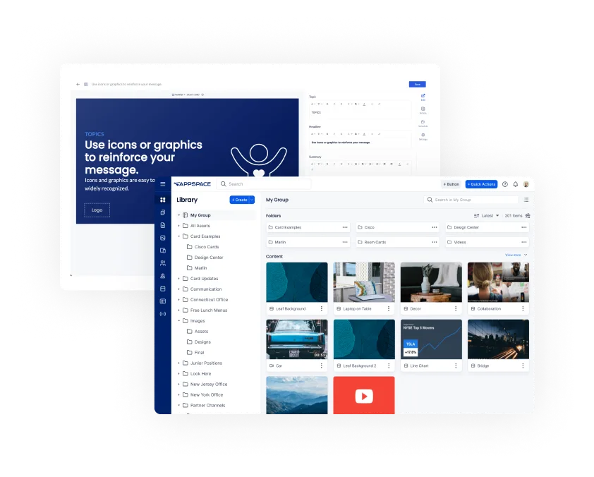 - Content Management System: Manage and control your content with a powerful, centralized CMS. The design studio combines flexibility with efficiency for creating, previewing, and publishing captivating content across multiple displays and locations.