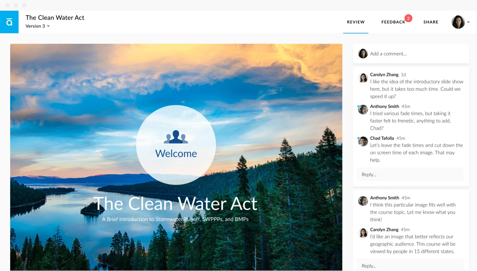 Accelerate your team’s projects by simplifying the review process. Everyone on your team can use Review 360 to get consolidated feedback from stakeholders on projects and publish your training resources to the rest of the organization faster.