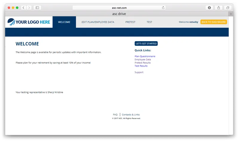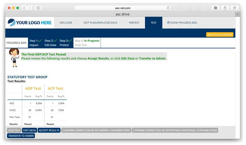 ASC DRIVE is a next-generation automation platform designed for plan sponsors to initiate and manage their own compliance testing online. It provides a branded, web-based interface to ASC’s Compliance Testing System, allowing plan sponsors to submit and review year-end data, and make real-time decisions on failed tests. The system offers customizable year-end questionnaires and user-friendly census data import with comprehensive checks for accuracy. Plan sponsors can conduct testing on their own timeline, with compliance experts available for assistance, including verifying match and ER contributions, identifying HCEs and Key Employees, assessing Top Heavy status, and analyzing ADP/ACP test results. The platform facilitates monitoring of plan sponsor progress and generates data files for corrections and allocations. This allows plan sponsors to take ownership of their compliance testing process, supported by expert guidance.