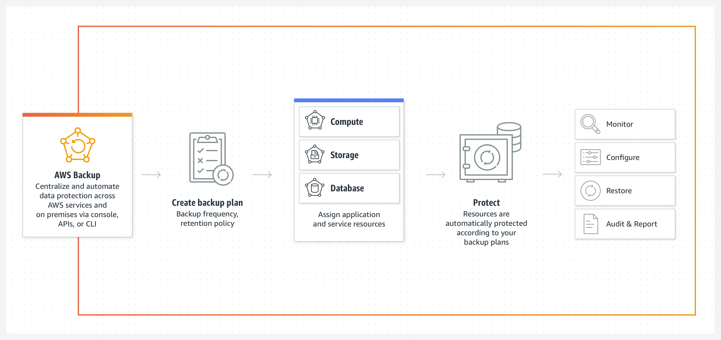 - Centrally manage data protection: AWS Backup provides you an automated solution to centrally configure backup policies across your applications comprised of AWS services, on-premises VMware, VMware Cloud on AWS, and VMware Cloud on AWS Outposts, helping you simplify backup lifecycle management, and making it easy to ensure that your application data across AWS and on premises is centrally protected.