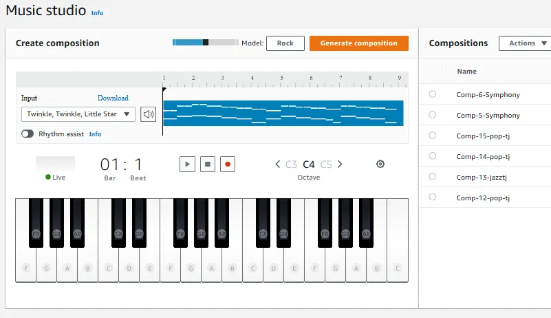 Generate an original musical composition using the pre-trained genre models in the AWS DeepComposer console. Choose from rock, pop, jazz, classical, or build your own custom genre.