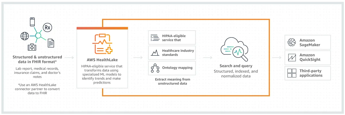 AWS HealthLake is a HIPAA-eligible service offering healthcare companies a complete view of individual and patient population health data using FHIR (Fast Healthcare Interoperable Resources) API based transactions to securely store and transform their data into a queryable format at petabyte scale, and further analyze this data using machine learning (ML) models. Using the HealthLake FHIR-based APIs, healthcare organizations can easily import large volumes of health data, including medical reports or patient notes, from on-premises systems to a secure, compliant, and pay-as-you-go service in the cloud. HealthLake offers built-in natural language processing (NLP) models to help customers understand and extract meaningful medical information from a single copy of raw health data, such as medications, procedures, and diagnoses.