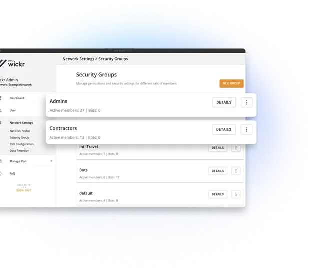 Administrators can create and manage AWS Wickr networks through the AWS Management Console. Flexible admin controls allow you to add and remove users and organize them into security groups. Individual devices or accounts can be suspended or removed, helping you reduce the risk of data exposure stemming from a lost or stolen device. Data retention can be configured and applied to both internal and external communications in a Wickr network.
