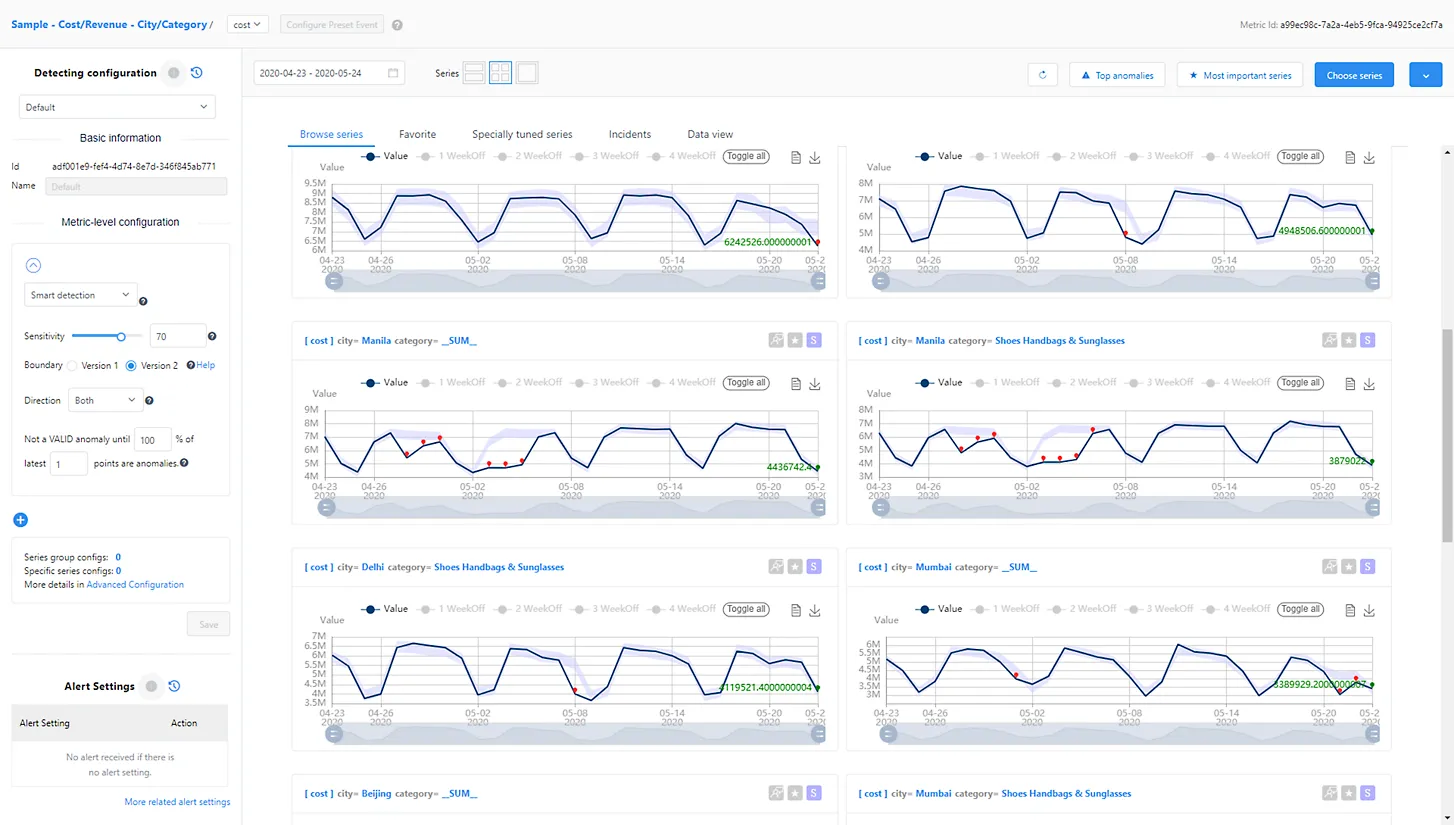 - End-to-end management of data monitoring is easily done through the AI Metrics Advisor interface, that plugs into popular time-series databases and provides stream monitoring support