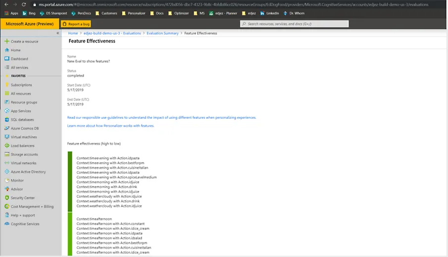 - **Easily gauge how it's working: **Interpret and evaluate AI Personalizer through the interface. Validate results by reproducing them, and gauge effectiveness of parameters with a stack-ranked view. For example, evaluate the impact of age, gender, and time of day on content engagement.