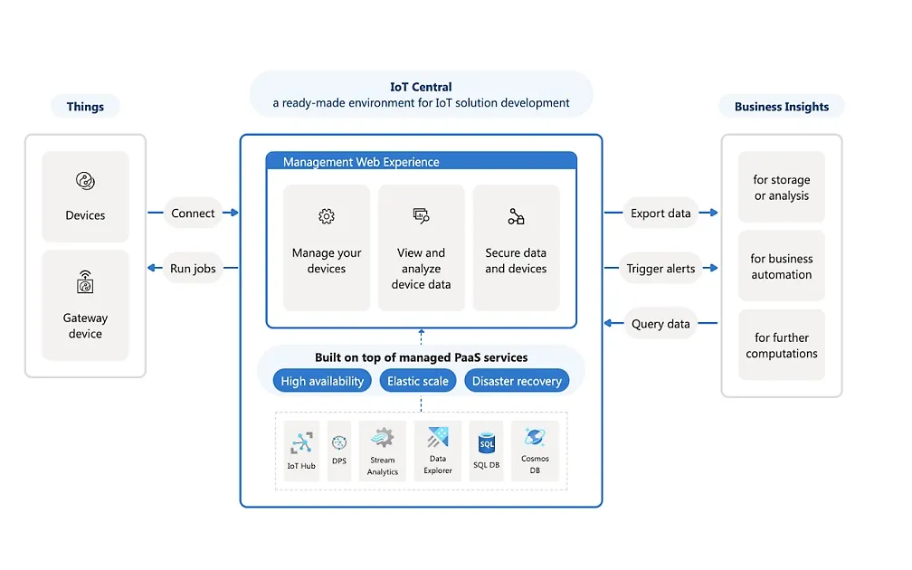 Azure IoT Central is a ready-made UX and API surface for connecting and managing devices at scale, delivering reliable data for business insights. It preassembles platform as a service (PaaS) offerings, bringing together each service beneath it for an easy-to-configure, comprehensive, and secure IoT offering.