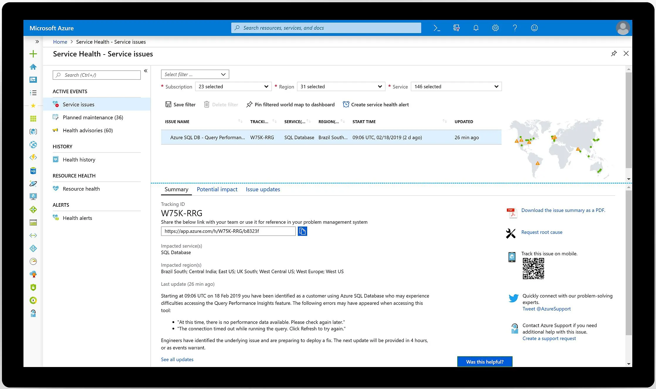 Azure Service Health notifies you about Azure service incidents and planned maintenance so you can take action to mitigate downtime. Configure customizable cloud alerts and use your personalized dashboard to analyze health issues, monitor the impact to your cloud resources, get guidance and support, and share details and updates.