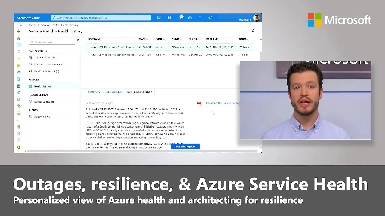 - **Download official reports and root cause analyses (RCAs): **Track events in real time on mobile devices or in your problem-management system with persistent links, and download official reports from Microsoft. Afterward, view your incident history and get RCAs to share with your stakeholders.