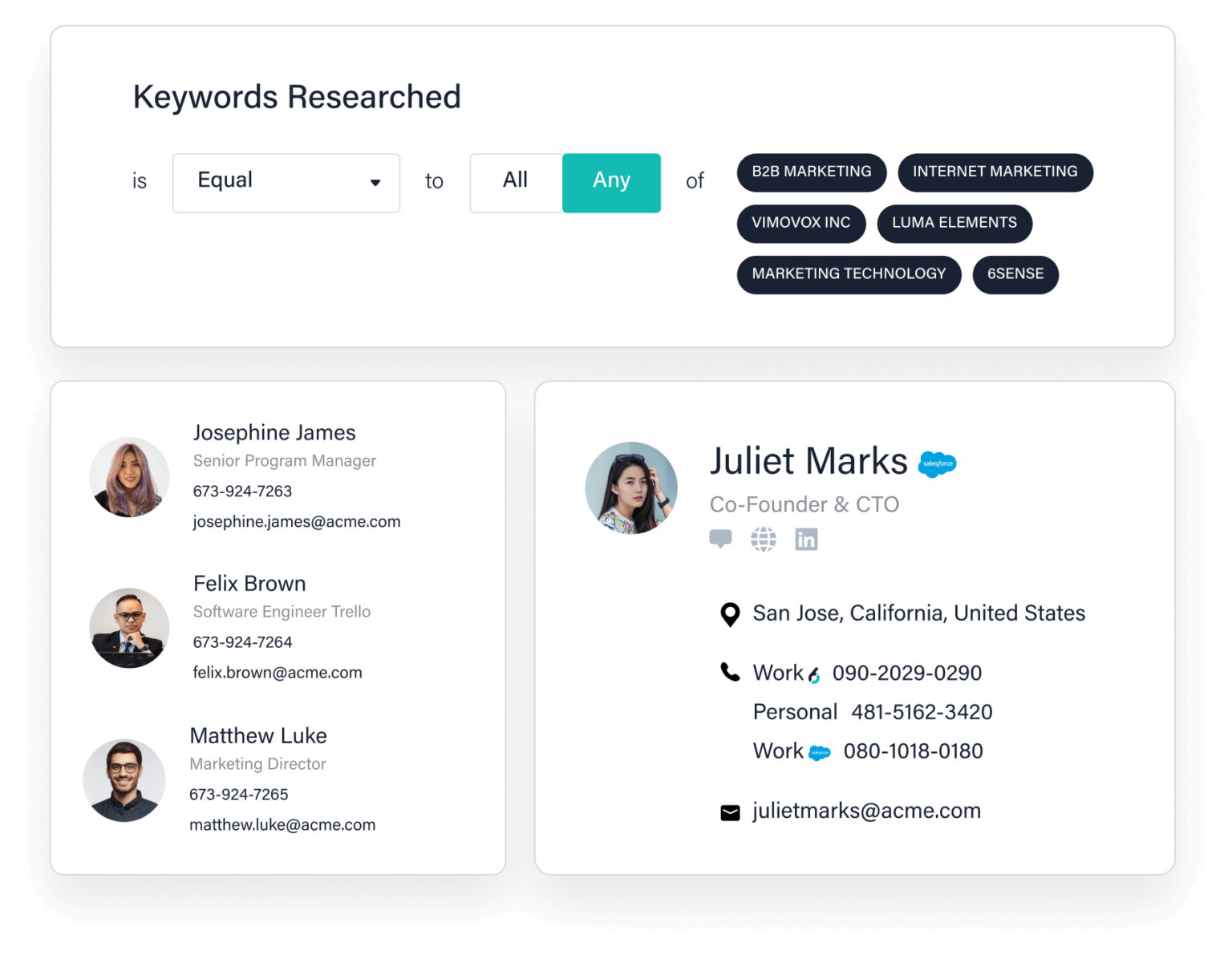 - **Buyer Discovery: **Discover new in-market buyers, acquire their contact information, and then add them to your lists, your CRM, and sales cadences.