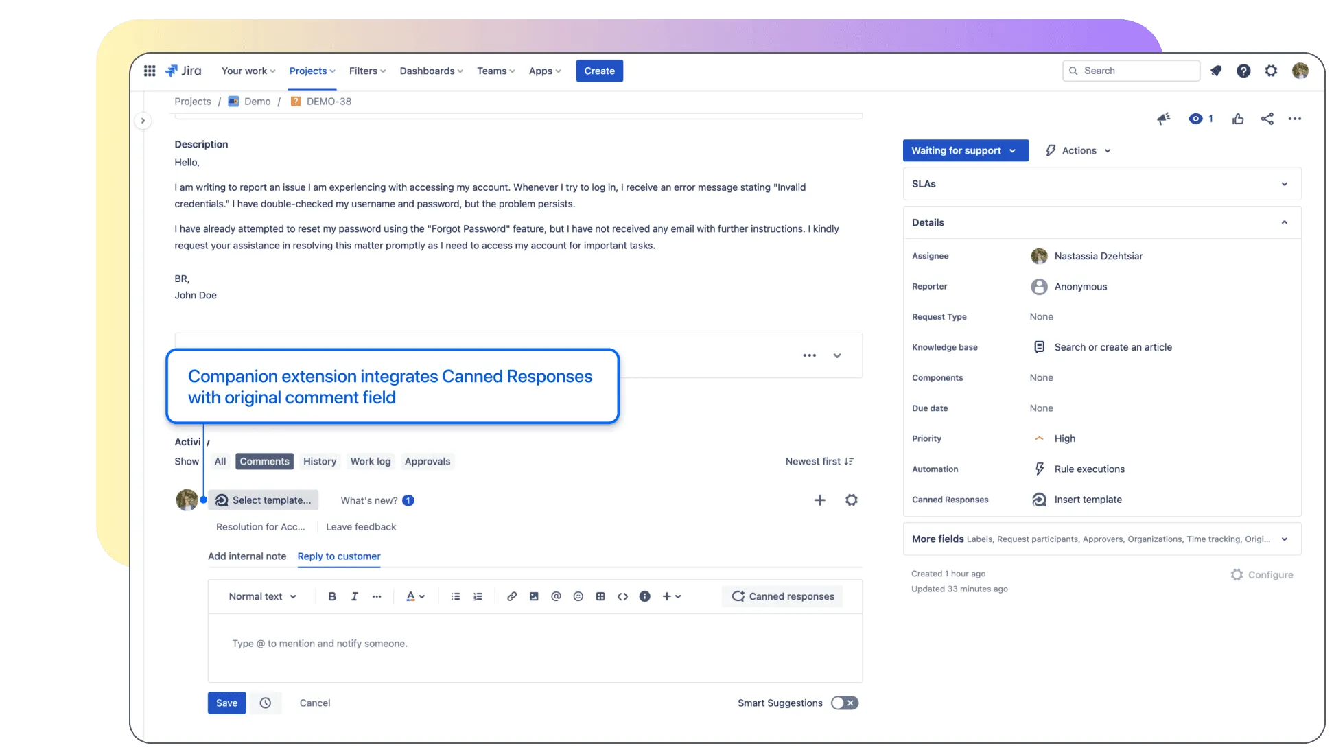 Tired of typing the same things over and over in Jira? Free up your time to focus on bigger things with canned responses.