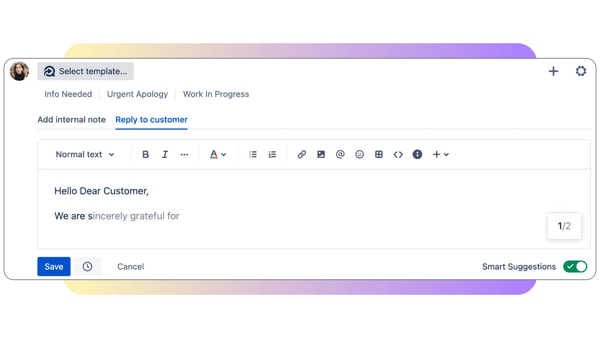 Smart suggestions is a powerful tool that offers response suggestions from your bank of canned responses templates and common phrases.