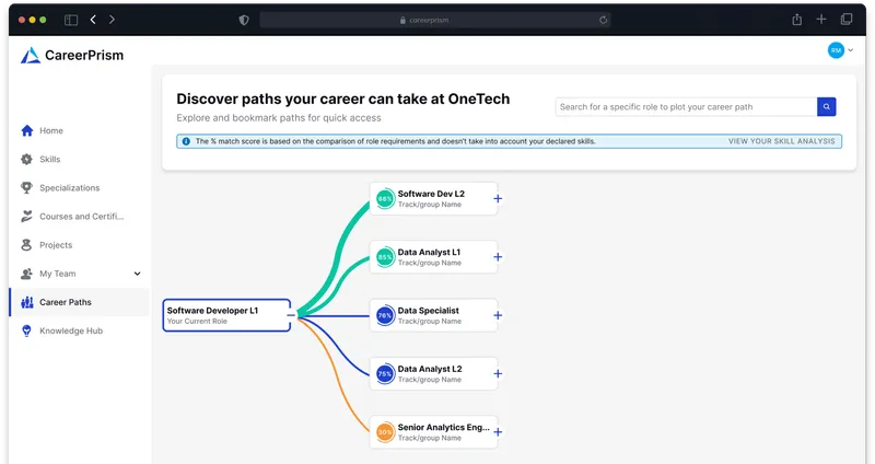 CareerPrism maps employee skills to career paths, fostering engagement and retention by visualizing role progressions and bridging skill gaps.
