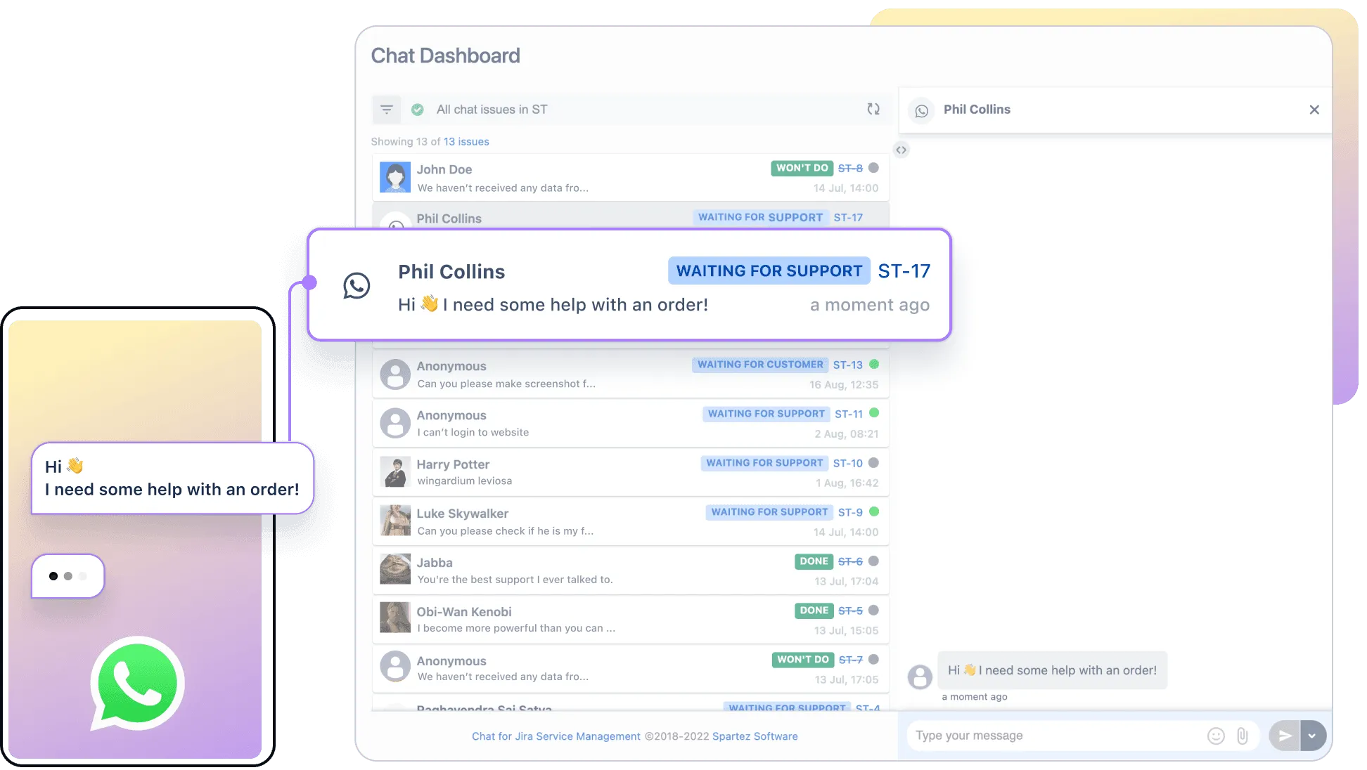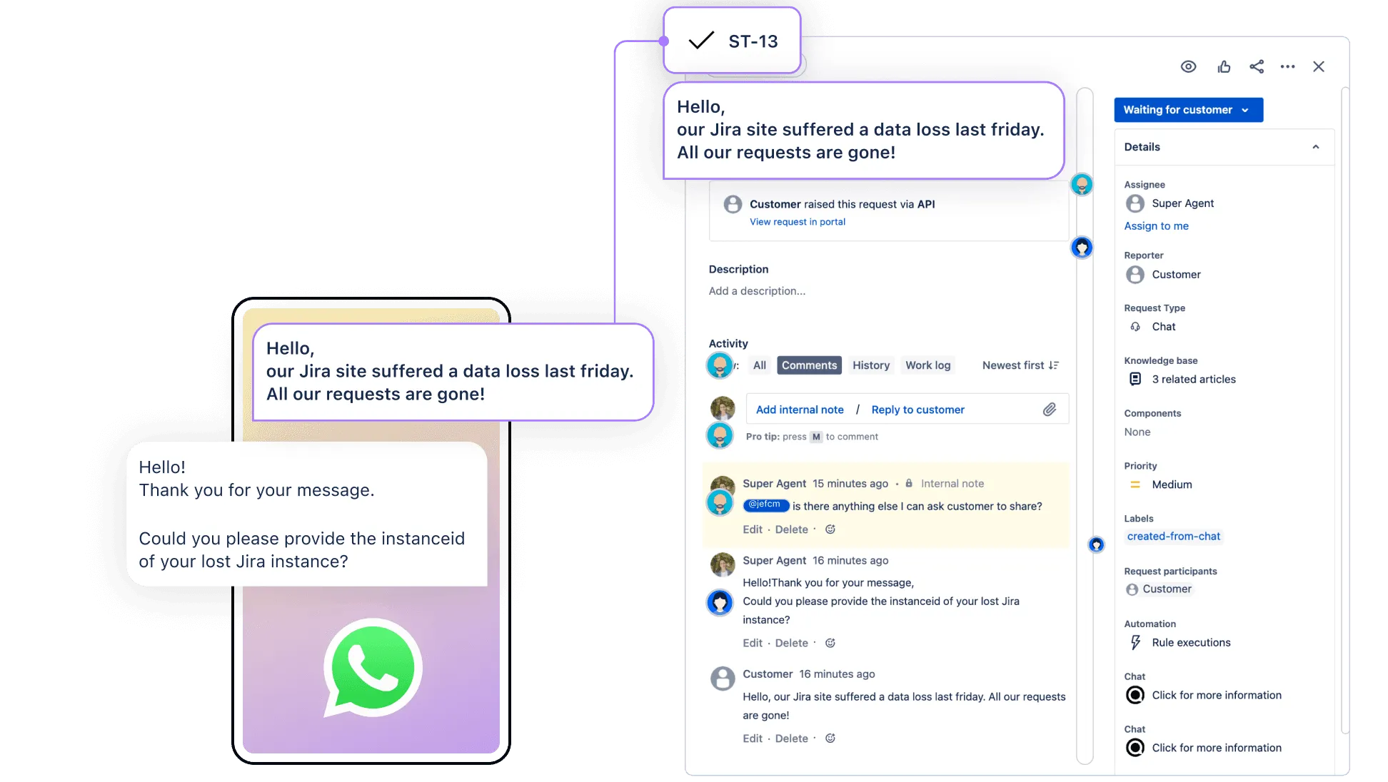 Chat for Jira Service Management allows teams to receive and reply to customer WhatsApp messages directly in Jira.