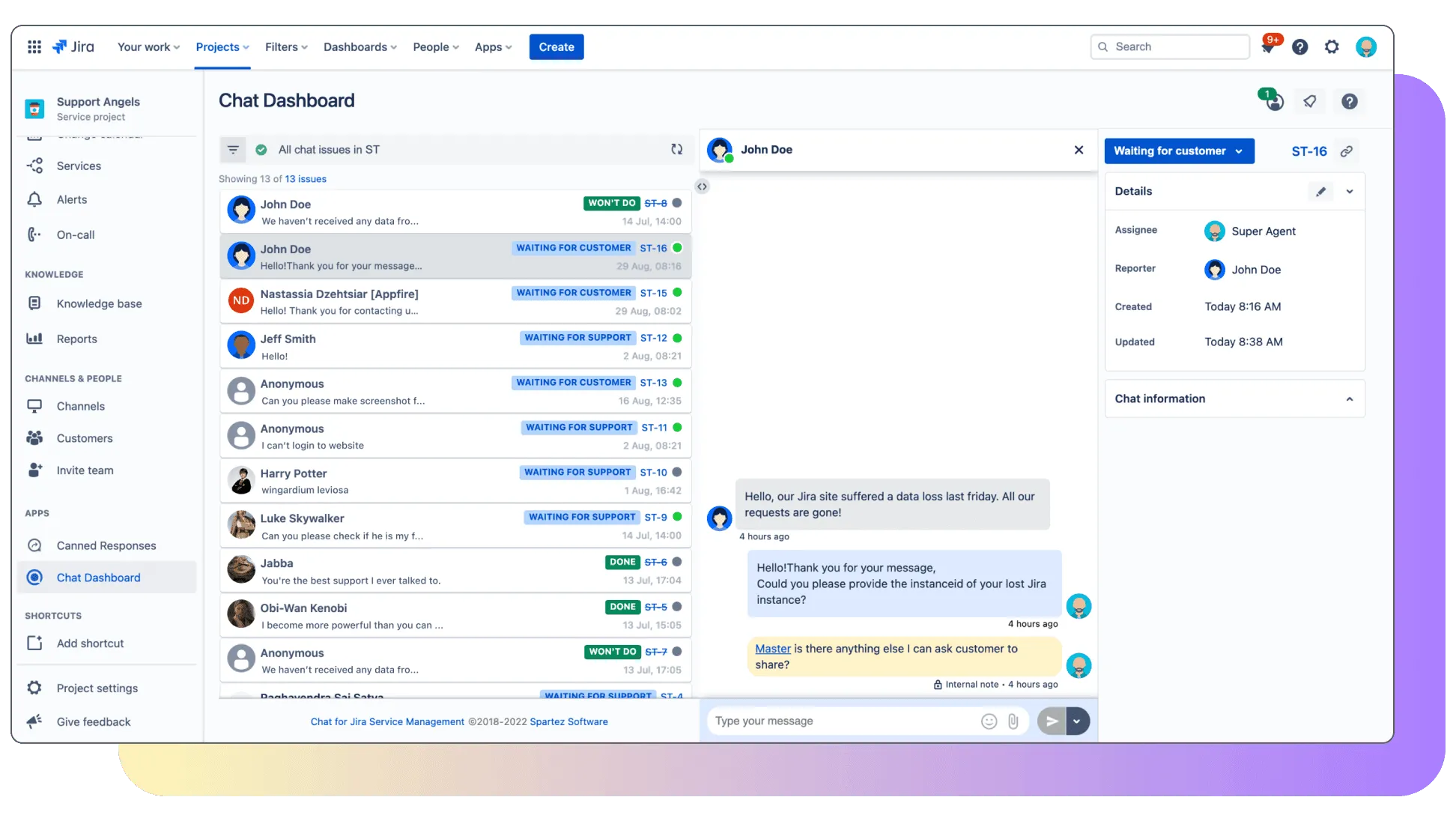 No need to keep customers hanging. Reduce the time to resolve customer issues with a live chat on a customer-facing website or Jira customer portal.