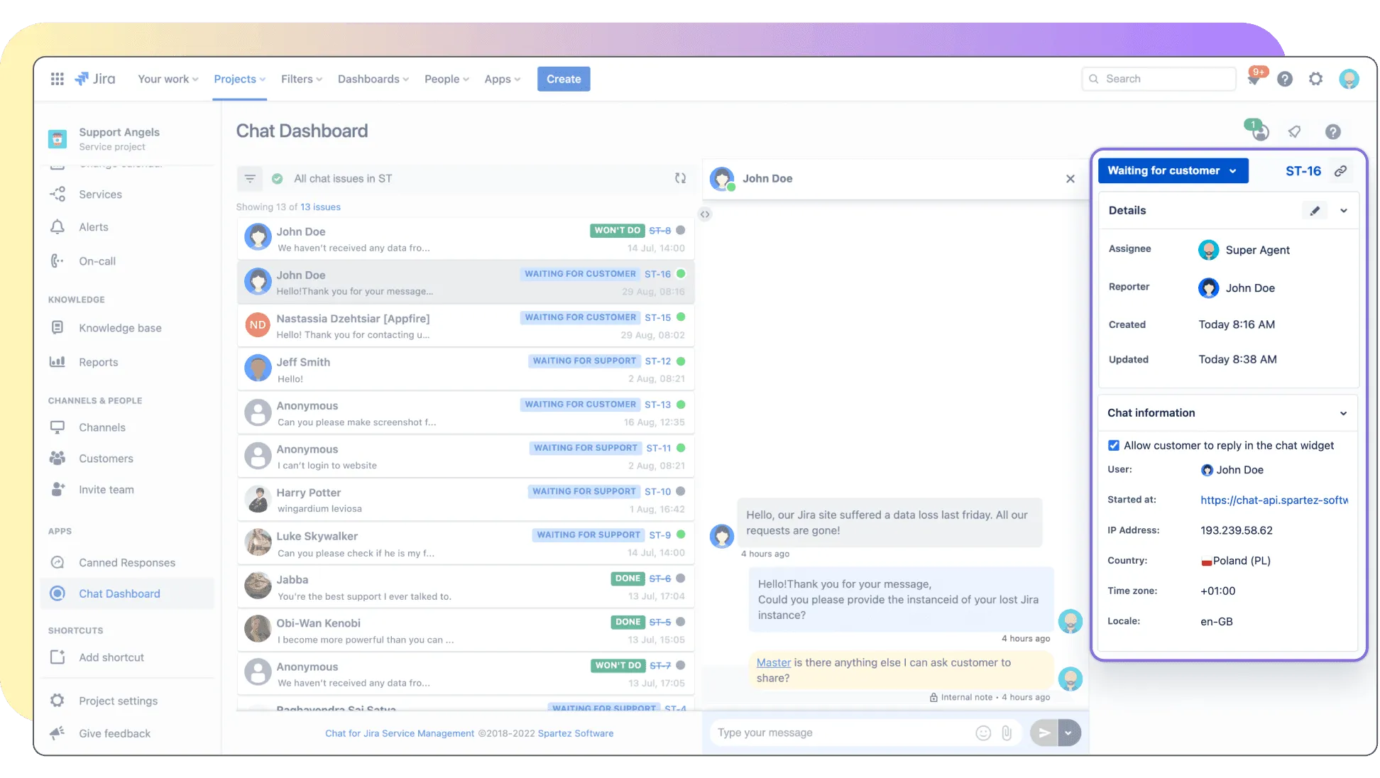 No more context switching—the Dashboard serves as a central location to respond to live chat conversations and other tickets in Jira.