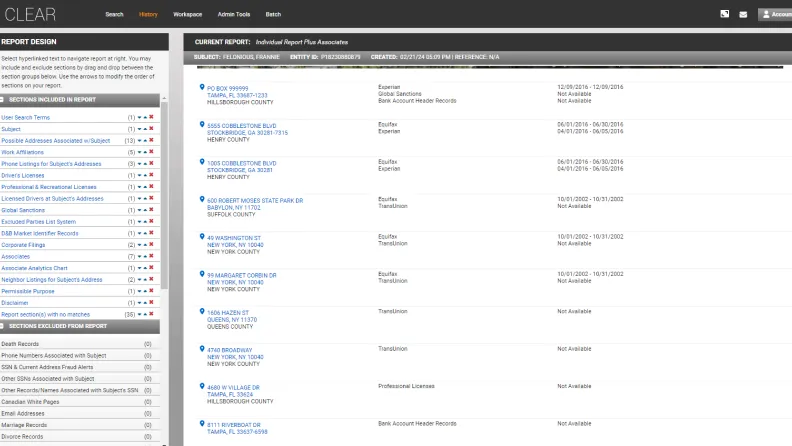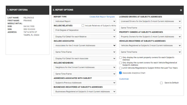 - **Customize reports to meet specific needs through unique personalization: **Document your findings through distinct report sections, including names, aliases, addresses, phone numbers, relatives, associates, and more. Personalize the display of the report to highlight specific sections or remove details that are not meaningful to you. Then, export and print reports to easily review or share important information.