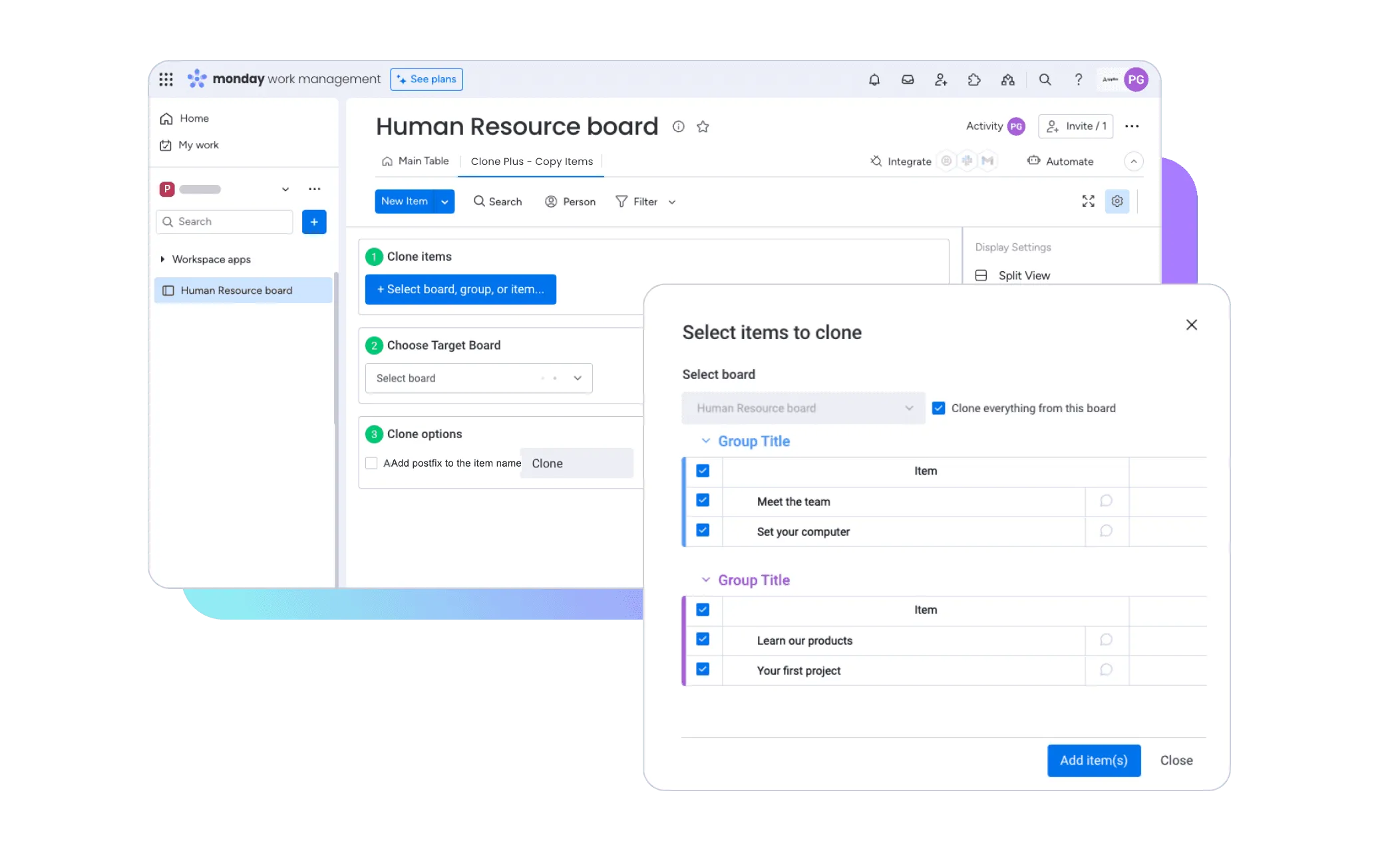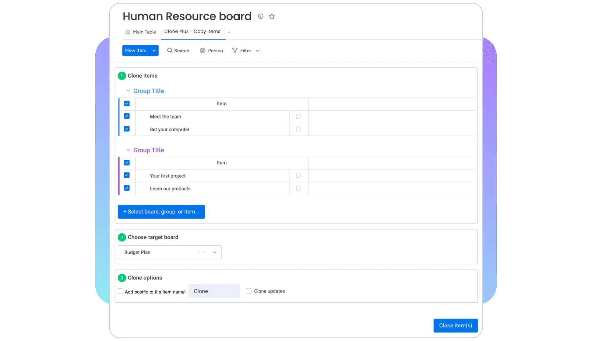 Clone Plus - Copy Items is your shortcut to seamless items duplication on monday.com.