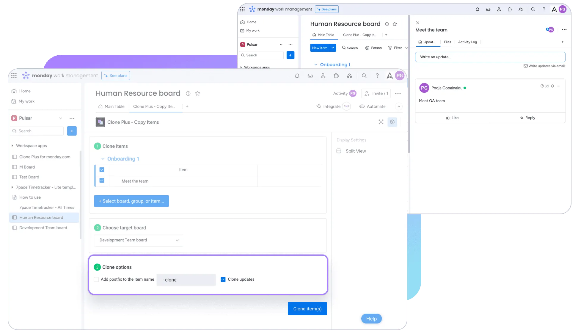 Keep things organized by quickly duplicating single or multiple items to the same or different board. Increase cross-team collaboration by duplicating and sharing items across boards.