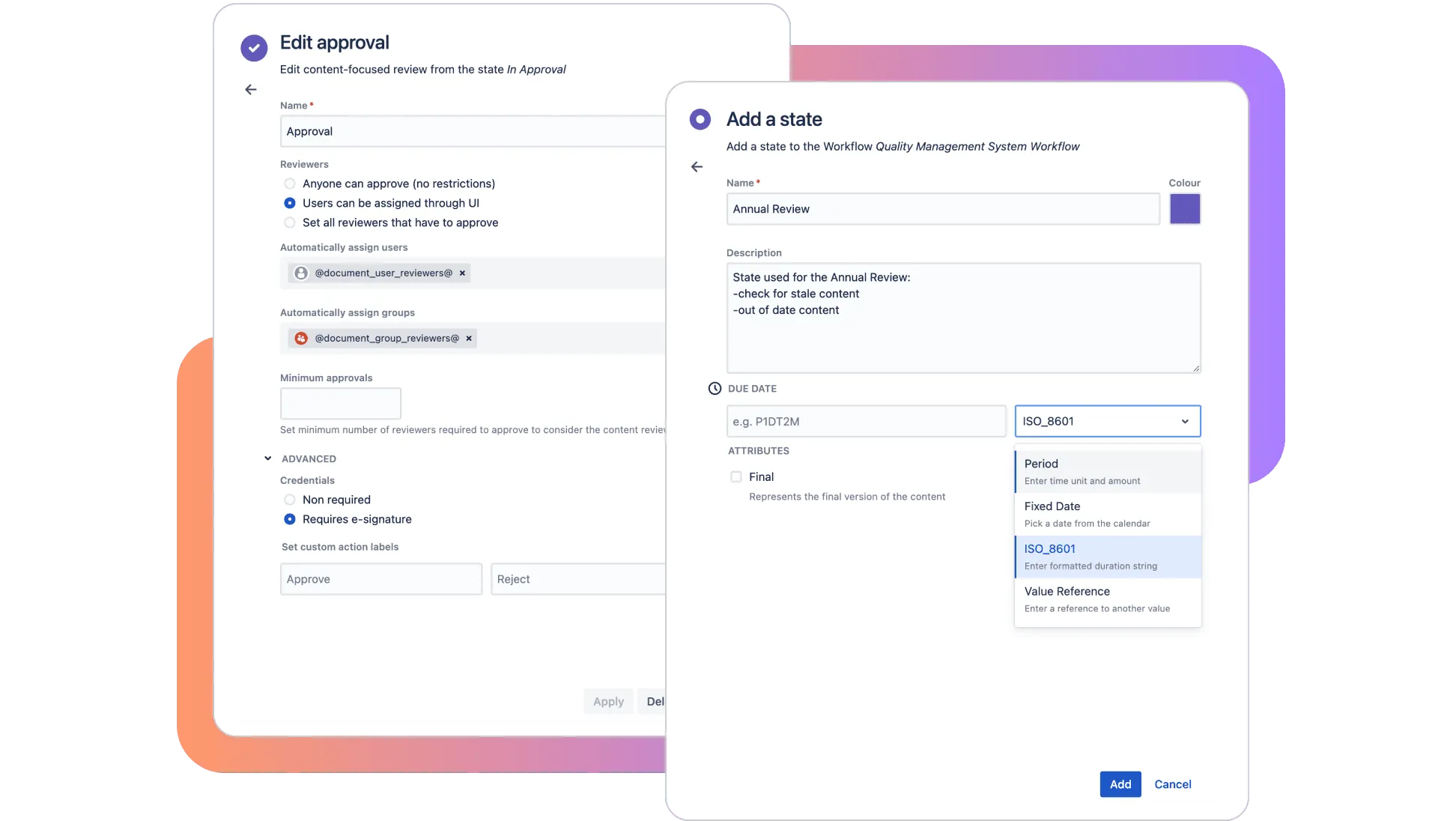 Embed state, status, and document activity data onto a page using macros. Data center users can add even more automation and use macros to control how the workflow functions.