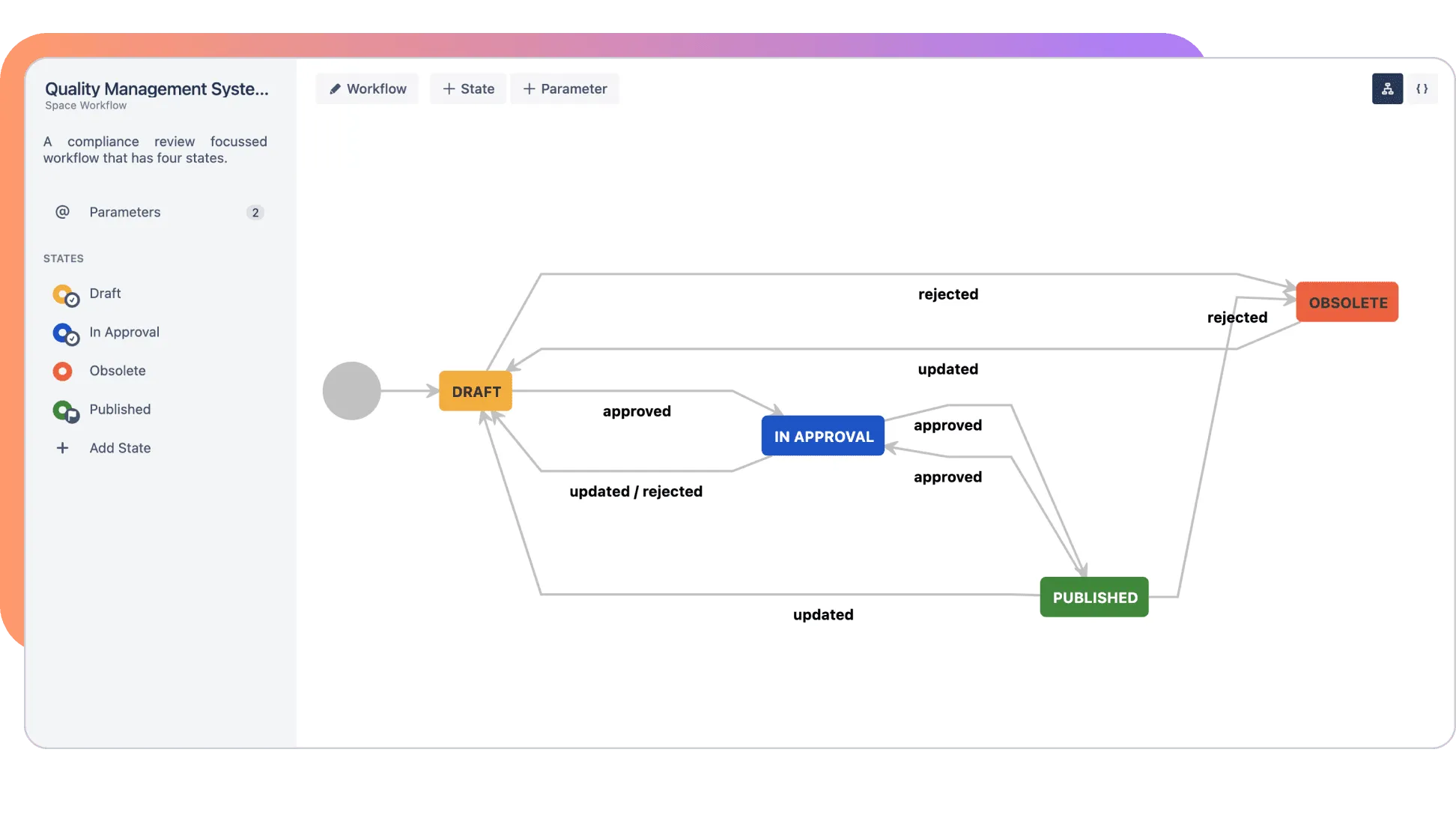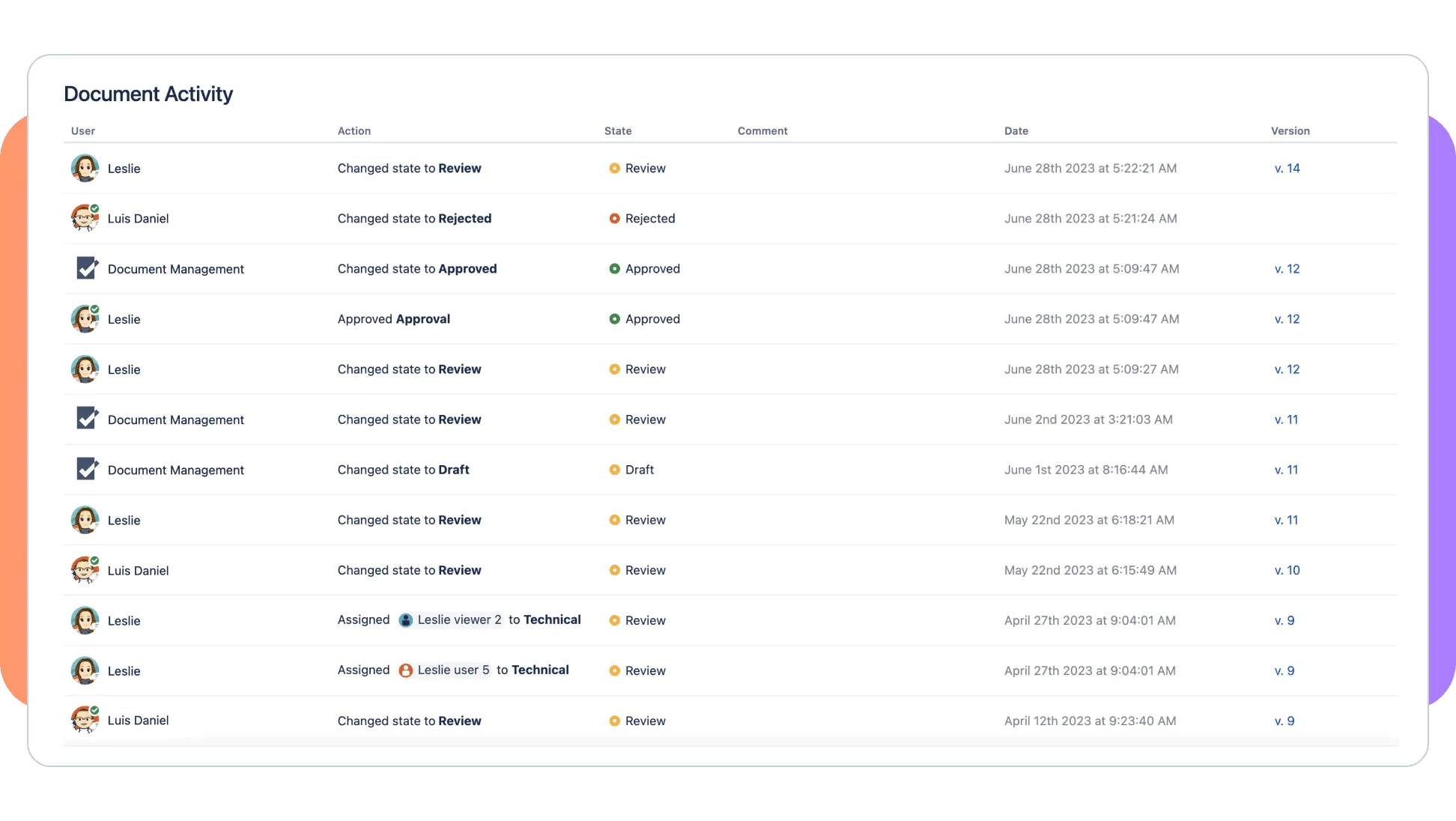 Displaying the workflow state adds transparency to your documents. Your team will know where a document is in its lifecycle, mitigating the risk of misinformation.