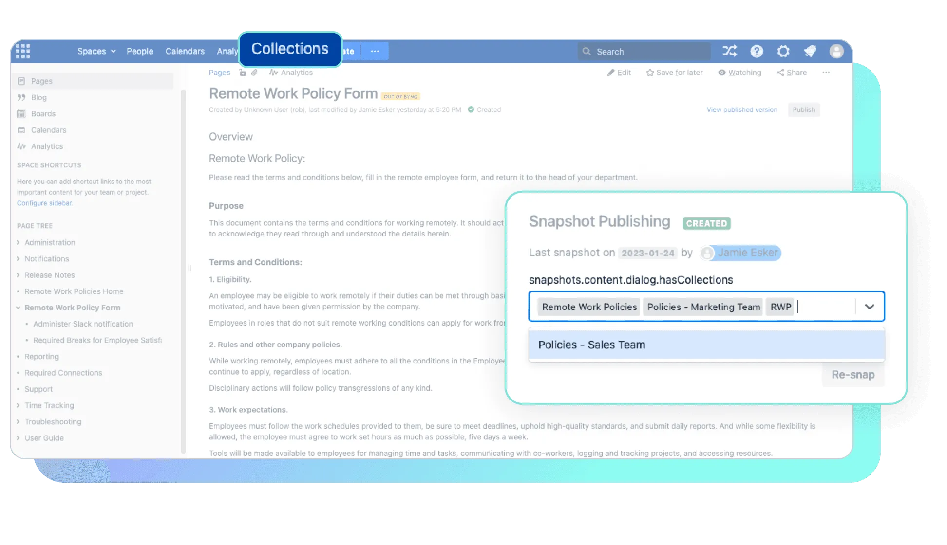 Publish content to a copied space or centralized repository to restrict audience access. This Improves document storage and distribution, while boosting efficiency and productivity.