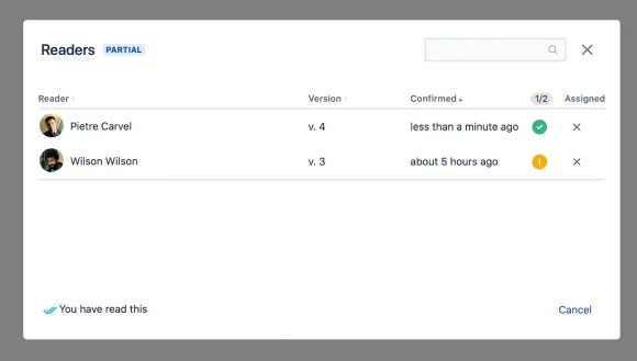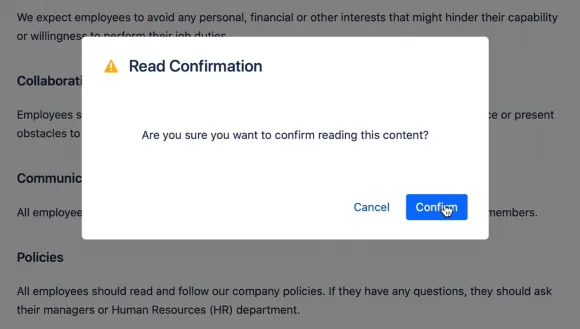 Quickly assign team members to read Confluence Cloud documents. Users can acknowledge reading a page in just seconds