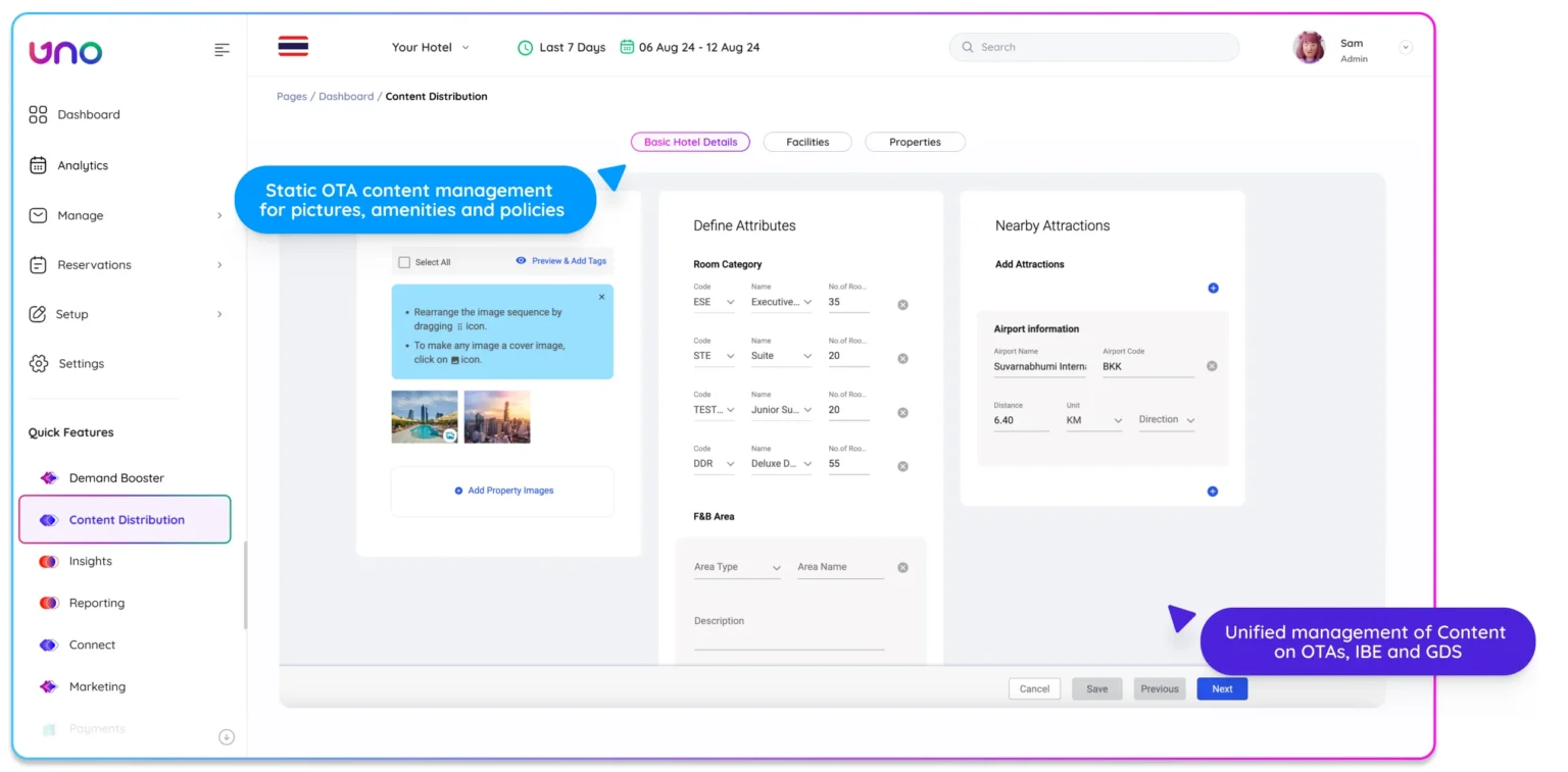 UNO by RateGain simplifies hotel content distribution with a single click to major OTAs, GDSs, and the UNO booking engine. It eliminates manual updates, ensuring your listings are always current, saving time and resources.
