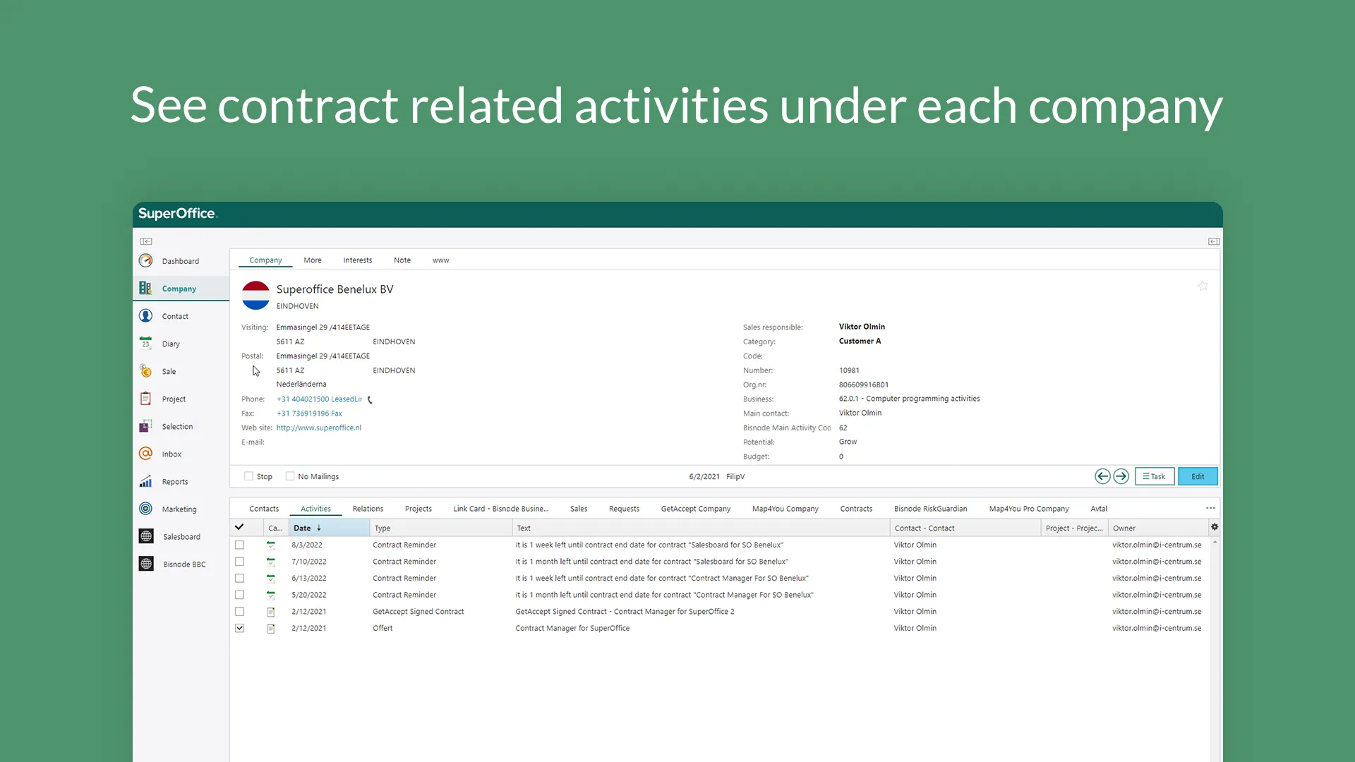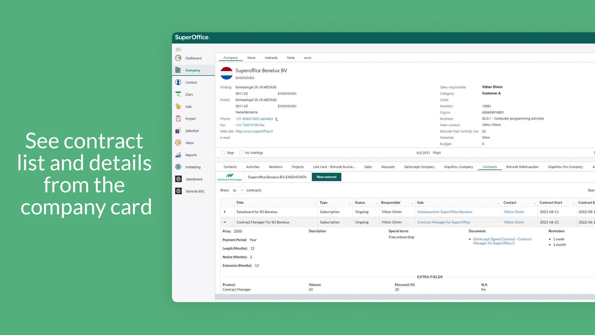 With Contract Manager, users can create, store, and track contracts directly from the customer's company card or the sales card in SuperOffice CRM. Get an overview of all contracts associated with each company and manage them with a click of a button. Users can also customize fields and workflows to align with their contract management processes.