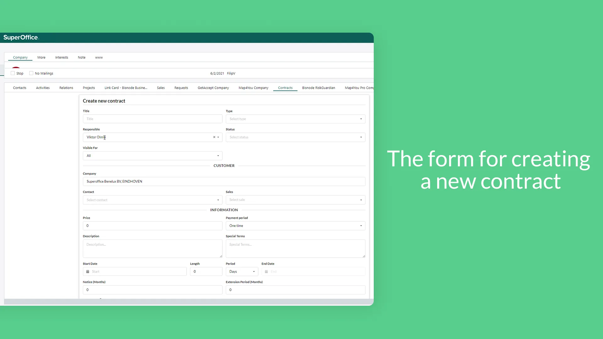 Together with SuperOffice CRM, Contract manager removes the need for manual data entry and eliminates the risk of errors, ensuring that every contract detail is accurately captured and managed. This saves valuable time and resources and enhances data integrity, enabling businesses to make informed decisions confidently and maintain compliance effortlessly.