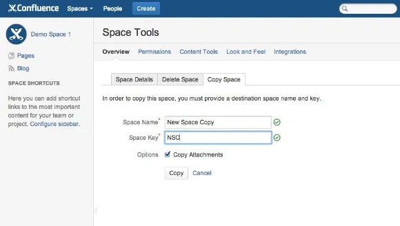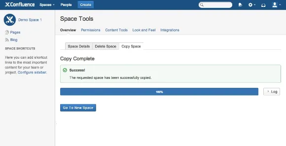 New tab allows for the copying of a Confluence space.