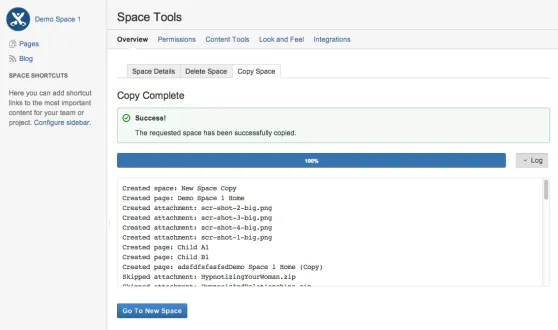 The Copy Space app gives a detailed log view of content copied. Also navigate directly to your new space via the "Go To New Space" button.