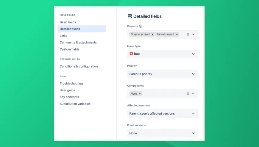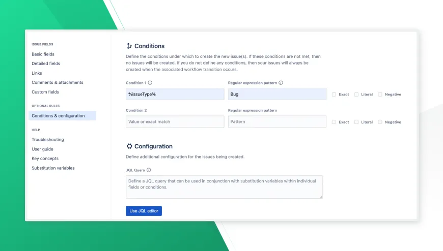 Easily configure optional conditions to determine whether an issue or subtask should be created or updated. Customize the conditions with substitution variables, regex patterns, or JQL queries for even more flexibility.