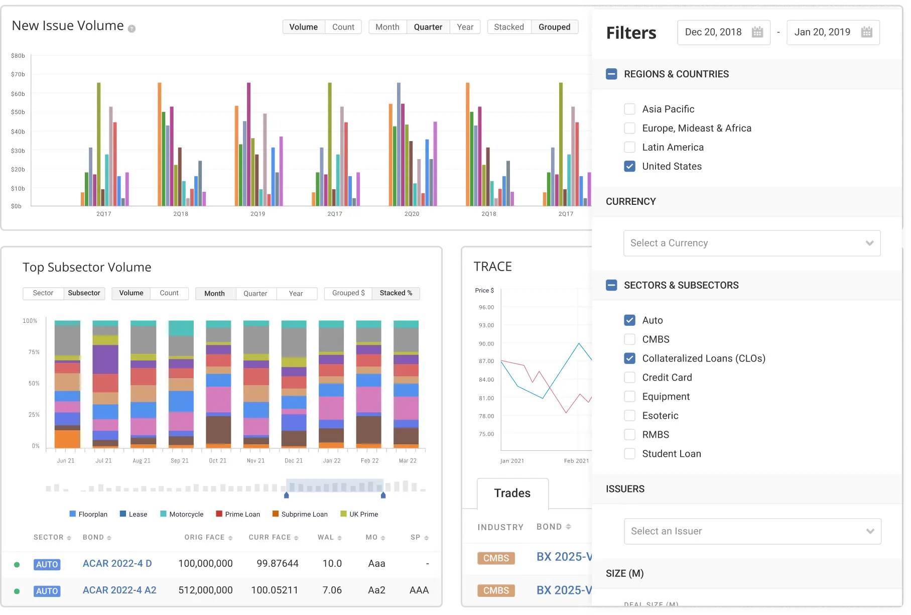 - Dynamic Charting & Visualizations: Interactive tools that respond to filters for trend analysis across sectors, issuers, and timeframes.
