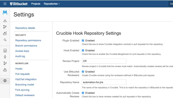 Download Crucible Review Hook for Bitbucket to leverage Crucible to enforce a more stringent code review process in your pull request workflow. Feature highlights: